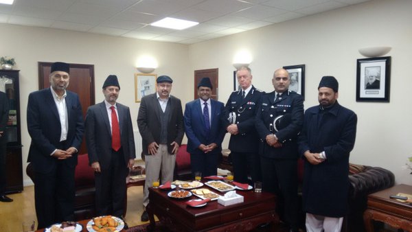 The Metropolitan Police Commissioner, Sir Bernard Hogan-Howe visited Baitul Futuh Mosque on Friday, 22 April, to offer reassurance to Ahmadiyya community leaders concerned about anti-Ahmadiyya sentiment following the recent murder of Asad Shah in Glasgow. The Commissioner was joined by Commander Mak Chishty, the Met’s lead for Community Engagement, to meet the leaders and emphasize the Met’s role in working with all communities to help keep London safe.